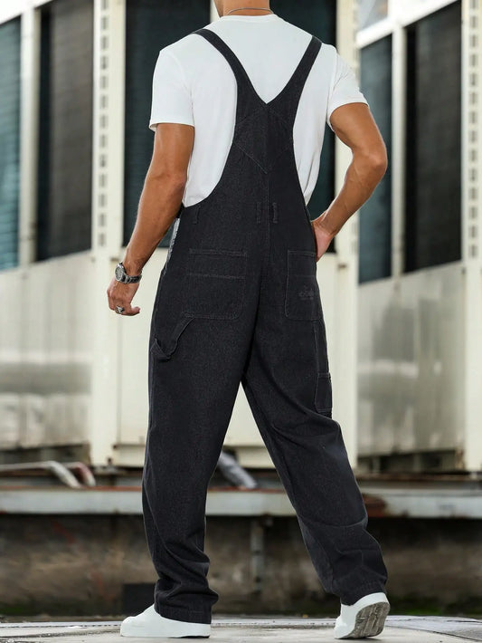 Trendy Men's Dark Gray Denim Overalls, with a Simple Workwear Design, Stylish Street Style, Suitable for All Seasonsjumpsuits